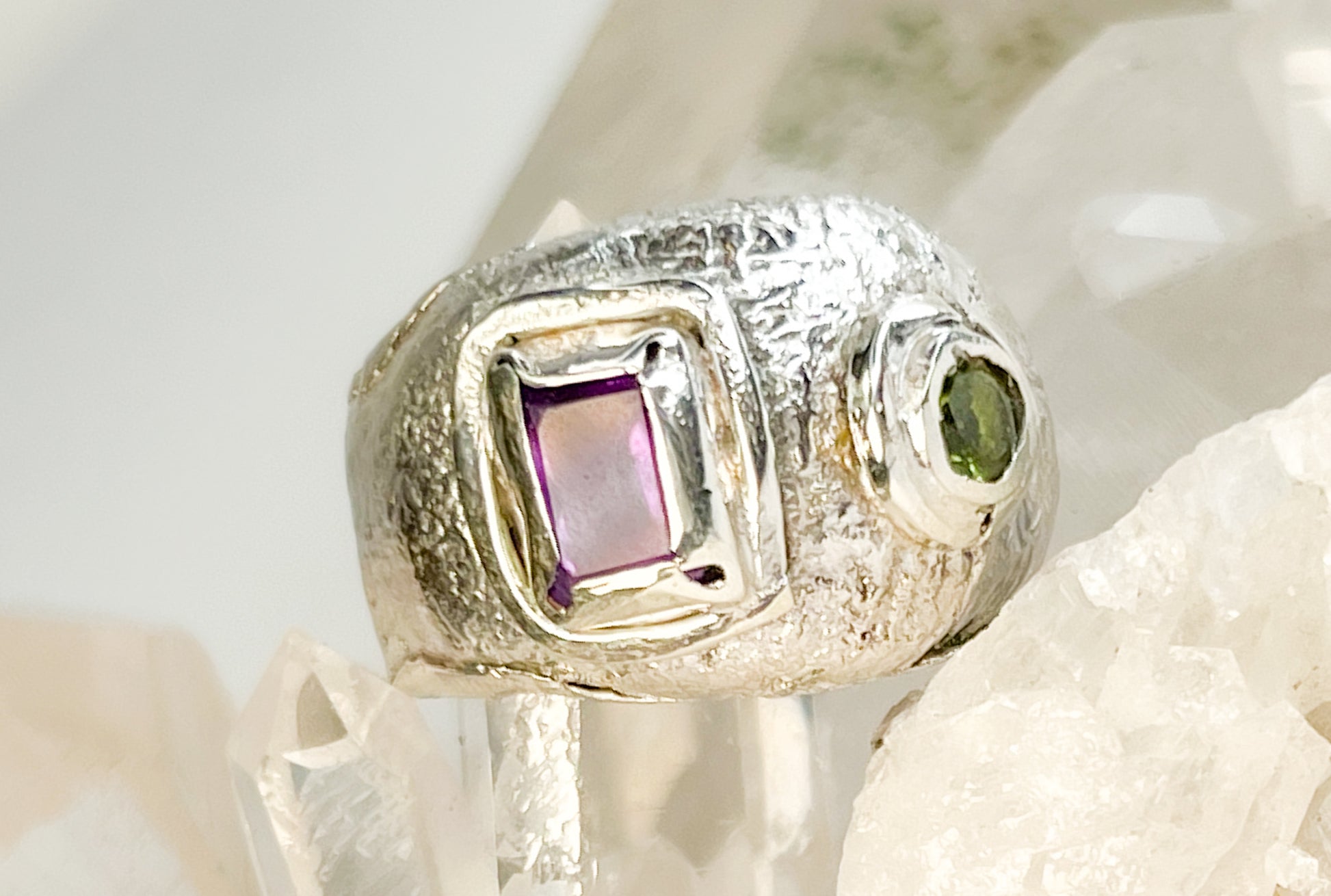 This stunning Amethyst and Peridot Sterling Silver Ring is a true statement piece, featuring the deep purple hues of amethyst and the vibrant green of peridot, set in high-quality sterling silver. Handcrafted with care, this elegant ring combines luxury and natural beauty, perfect for adding a touch of sophistication to any outfit. Whether you're looking for a unique gift or a special addition to your jewelry collection, this gemstone ring offers timeless style and exceptional craftsmanship. Ideal for both everyday wear and special occasions, it’s a must-have for any jewelry lover.