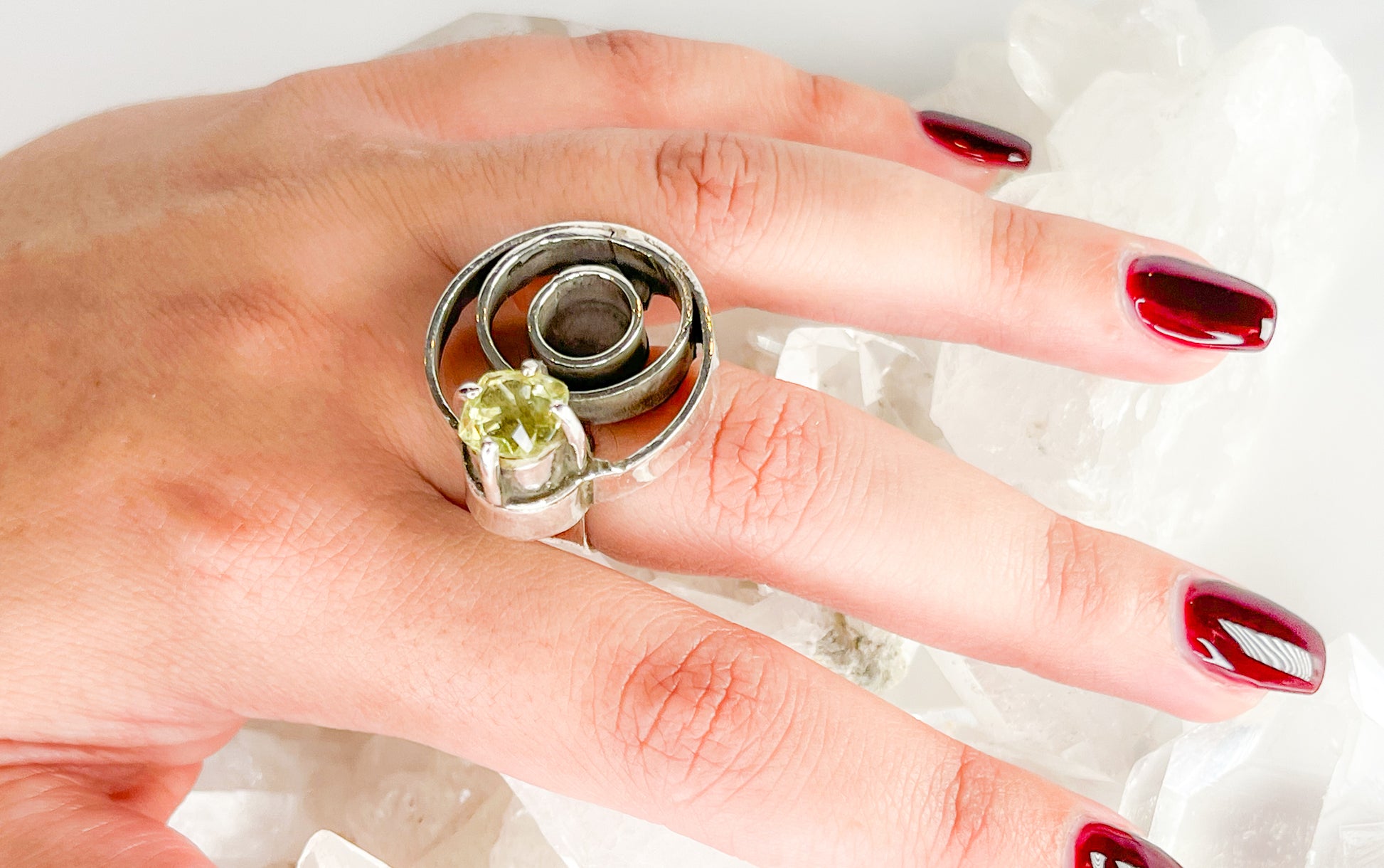 A stunning cluster of colorful gemstones that will brighten any outfit. Perfect for adding a fun twist to your look, this ring have a green golden citrine quartz