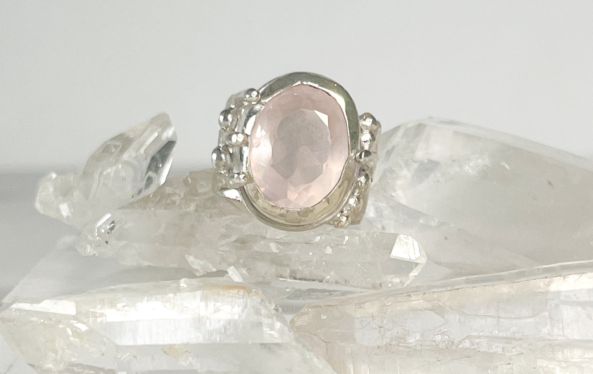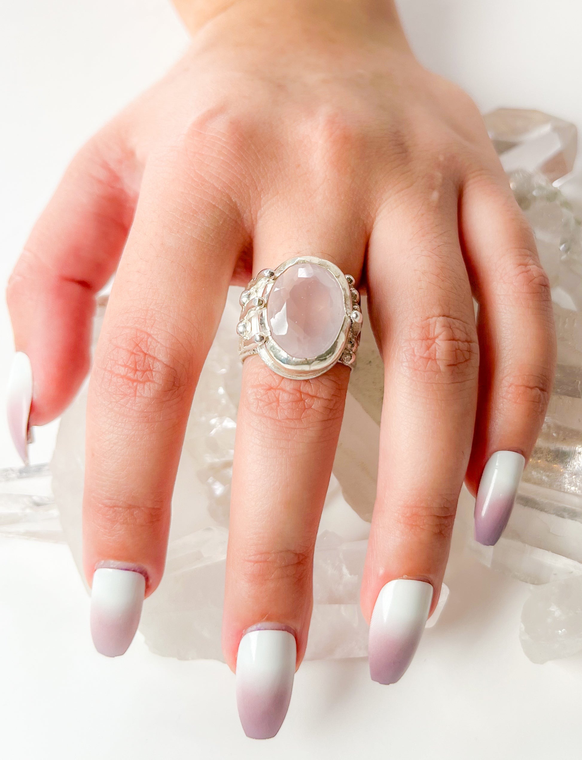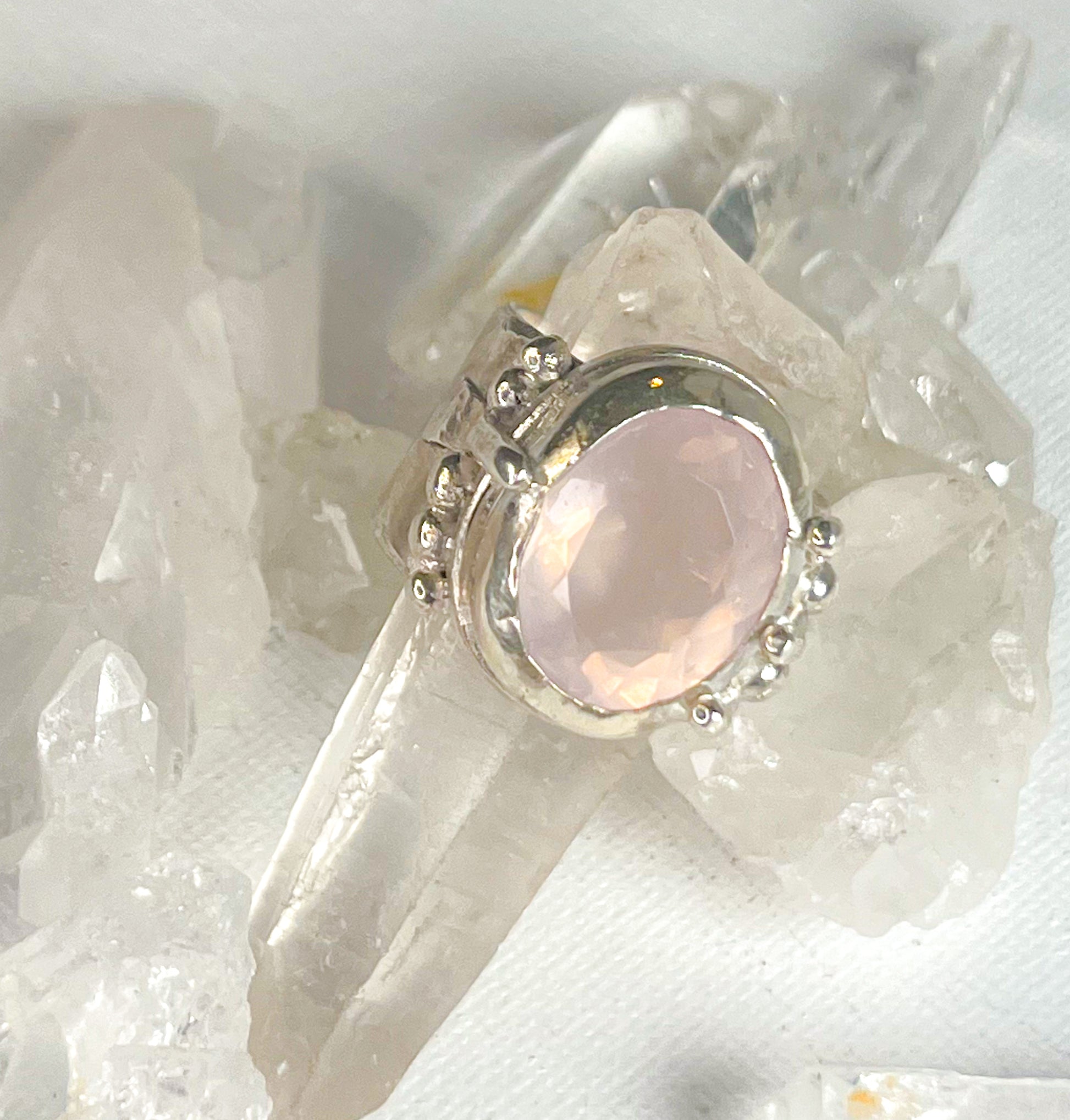 This stunning ring is crafted from solid sterling silver and features a natural, untreated Rose Quartz stone. Known as the stone of love, Rose Quartz symbolizes a powerful energy for those seeking to bring more love and harmony into their lives. Its gentle pink hue and healing properties connect deeply to the heart chakra, the center of love and compassion, promoting emotional healing and self-love. Designed for both comfort and elegance, the smooth silver band fits perfectly on any finger, making it ideal for everyday wear or as a meaningful gift. Celebrate love with this timeless piece.